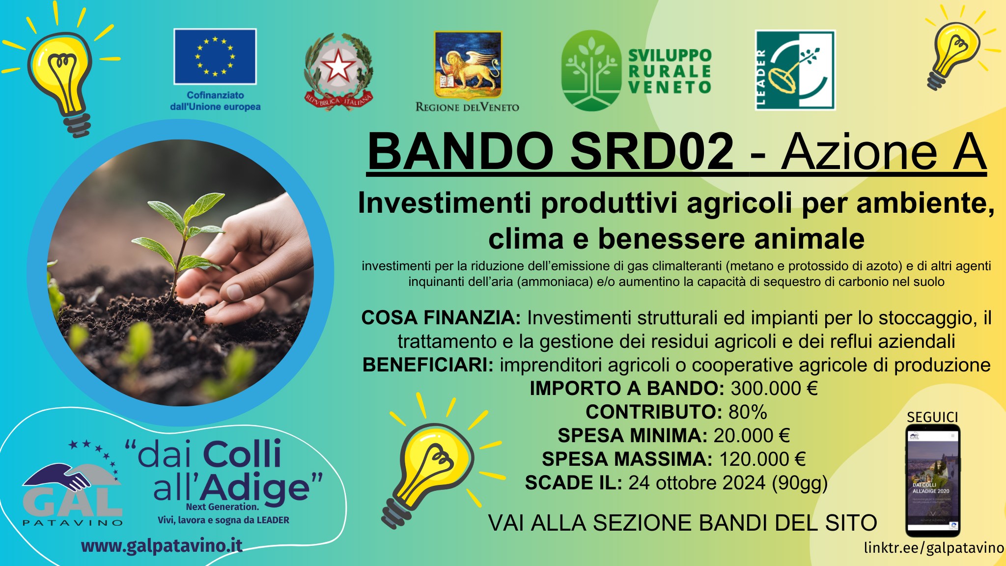 Il GAL PATAVINO ha pubblicato il bando relativo alla misura "SRD02 Azione A “Investimenti per la mitigazione dei cambiamenti climatici”. Il Bando, rivolto agli Agricoltori del territorio di riferimento del Gal (Agna, Anguillara Veneta, Arquà Petrarca, Bagnoli di Sopra, Baone, Barbona, Battaglia Terme, Boara Pisani, Borgo Veneto, Cartura, Casale di Scodosia, Castelbaldo, Cinto Euganeo, Conselve, Due Carrare, Este, Galzignano Terme, Granze, Lozzo Atestino, Masi, Megliadino San Vitale, Merlara, Monselice, Montagnana, Montegrotto Terme, Ospedaletto Euganeo, Pernumia, Piacenza d'Adige, Ponso, Pozzonovo, Rovolon, San Pietro Viminario, Santa Caterina d’Este, Sant'Elena, Sant'Urbano, Stanghella, Teolo, Torreglia, Tribano, Urbana, Vescovana, Villa Estense e Vo’), ..