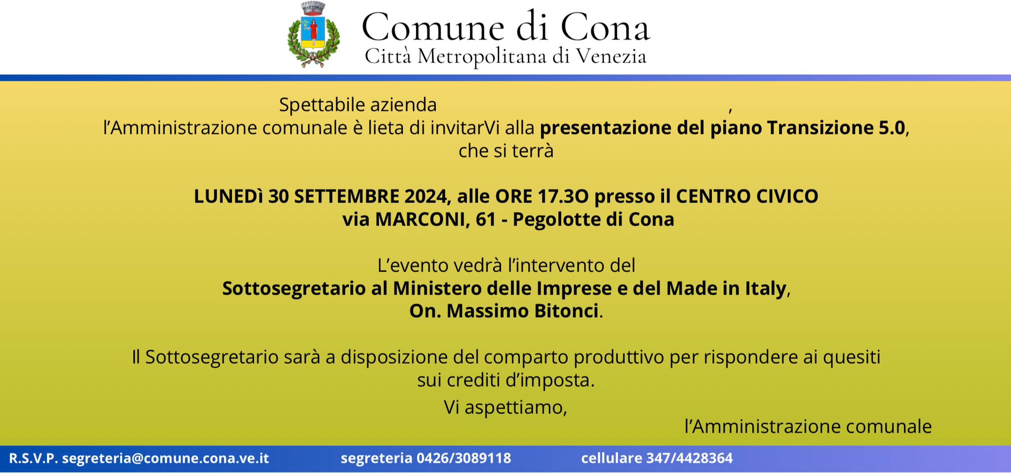 Lunedì 30 settembre alle ore 17:30 presso il Centro Civico di Pegolotte di Cona il Comune di Cona Vi invita alla presentazione del piano Transizione 5.0 alla presenza del Sottosegretario al Ministero delle Imprese e del Made in Italy On. Massimo Bitonci.