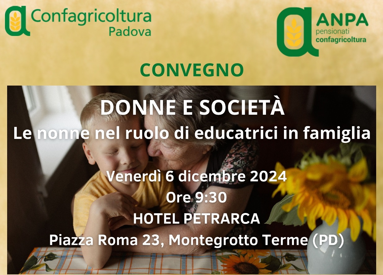 L'ANPA - Associazione Nazionale Associazione Nazionale Pensionati Agricoltori di Padova organizza per venerdì 6 dicembre presso l'Hotel Petrarca - Piazza Roma n. 23 - Montegrotto Terme (PD) dalle ore 9:30, il Convegno “Donne e Società: Le nonne nel ruolo di educatrici in famiglia”. L'occasione sarà un momento prezioso per riflettere insieme su come il ruolo delle nonne influenzi le nuove …