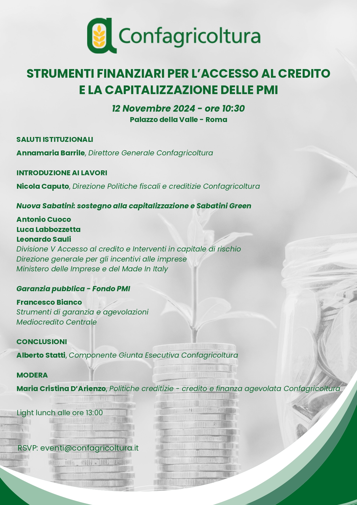 Martedì 12 novembre alle ore 10.30 presso Palazzo della Valle a Roma si terrà il convegno, organizzato da Confagricoltura, su "Strumenti finanziari per l'accesso al credito e la capitalizzazione delle PMI"