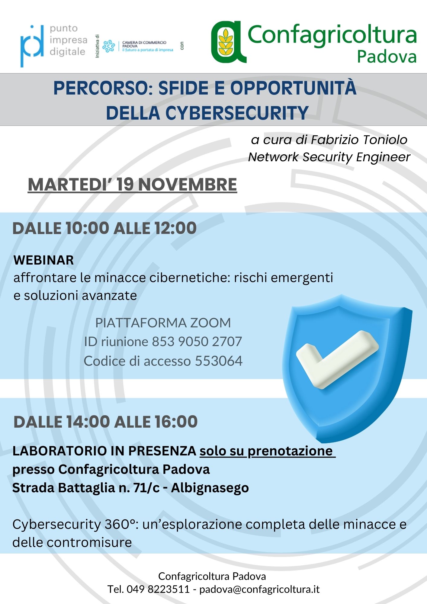 Confagricoltura Padova, in collaborazione con la Camera di Commercio di Padova, organizza per martedì 19 novembre un percorso formativo sulla cybersicurezza tenuto dal Network Security Engineer Fabrizio Toniolo.