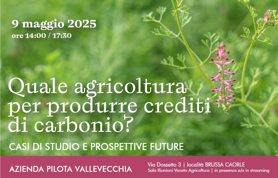 Venerdì 9 maggio dalle ore 14:00 alle ore 17.30 presso l'Azienda Pilota Vallevecchia di Caorle si terrà il convegno 'Quale agricoltura per produrre crediti di carbonio?' L'obiettivo del convegno è presentare i dati scientifici di lungo periodo su sperimentazioni di ripristino dello stock di carbonio per la fertilità del suolo in agricoltura rigenerativa, biologica e biodinamica, per capire quali sono le migliori pratiche che potranno portare ad uno schema di certificazione dei relativi crediti di carbonio.