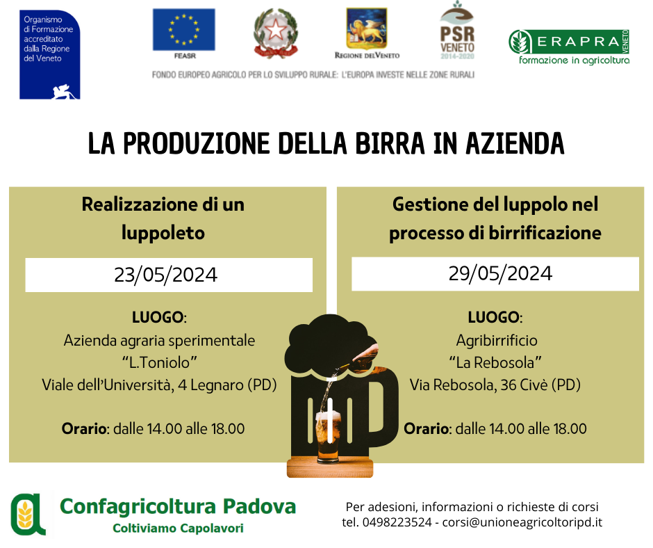 Erapra del Veneto in collaborazione con Confagricoltura Padova, organizza per il mese di maggio un seminario finanziato dal PSR Veneto 2014/2022 dal titolo “La produzione della birra in azienda”. Il seminario, con una durata complessiva di 8 ore, ha lo scopo di raccontare la birra agricola, dalla terra alla tavola. Le fasi di coltivazione del luppolo verranno illustrate dal professor Stefano Bona dell’Università di Padova; mentre presso l’agribirrificio “La Rebosola”, si avrà modo di conoscere come viene organizzata la cantina e l’intero processo di birrificazione. Il corso, gratuito, è esclusivamente rivolto ad imprenditori agricoli, loro partecipi familiari, coadiuvanti iscritti all’INPS e dipendenti agricoli. Il termine delle iscrizioni è previsto per il giorno 17/05.